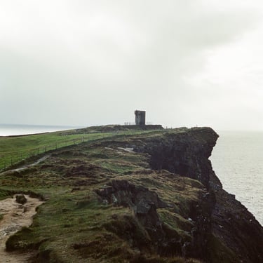 The third and last way to acess the cliffs is by the walking trail in Liscannor. The trail is at the south end of the cliffs and will take you to the Moher Tower at Hag's head. It is about a 12 minute walk from the begining of the trail to the edge of the cliffs. The trail cuts through beautiful farm land before arriving the south end of the cliffs. From this view point you will just be able to make out O'Brien's Tower just north of the visitors center and a great view of the steep cliffs. There is a parking lot near the trail head where you can park for a small fee.